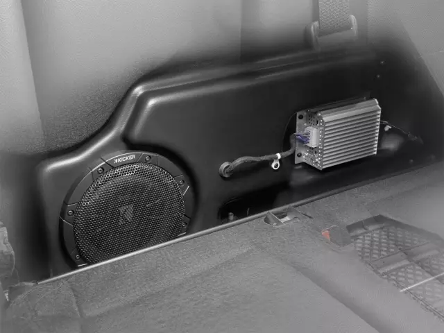 Enclosure is designed specifically for the F-150. 100 watt RMS amp with 8in dual voice coil- long-throw woofer. Back wall of cab mounting maintains flat load floor Utilizes factory mounting points...no drilling. Compatible with 2.7L EcoBoost with start/stop feature. REQUIRES Dealer installation and programming via OBD. Subwoofer by Kicker® (Requires Dealer Installation and Programming).